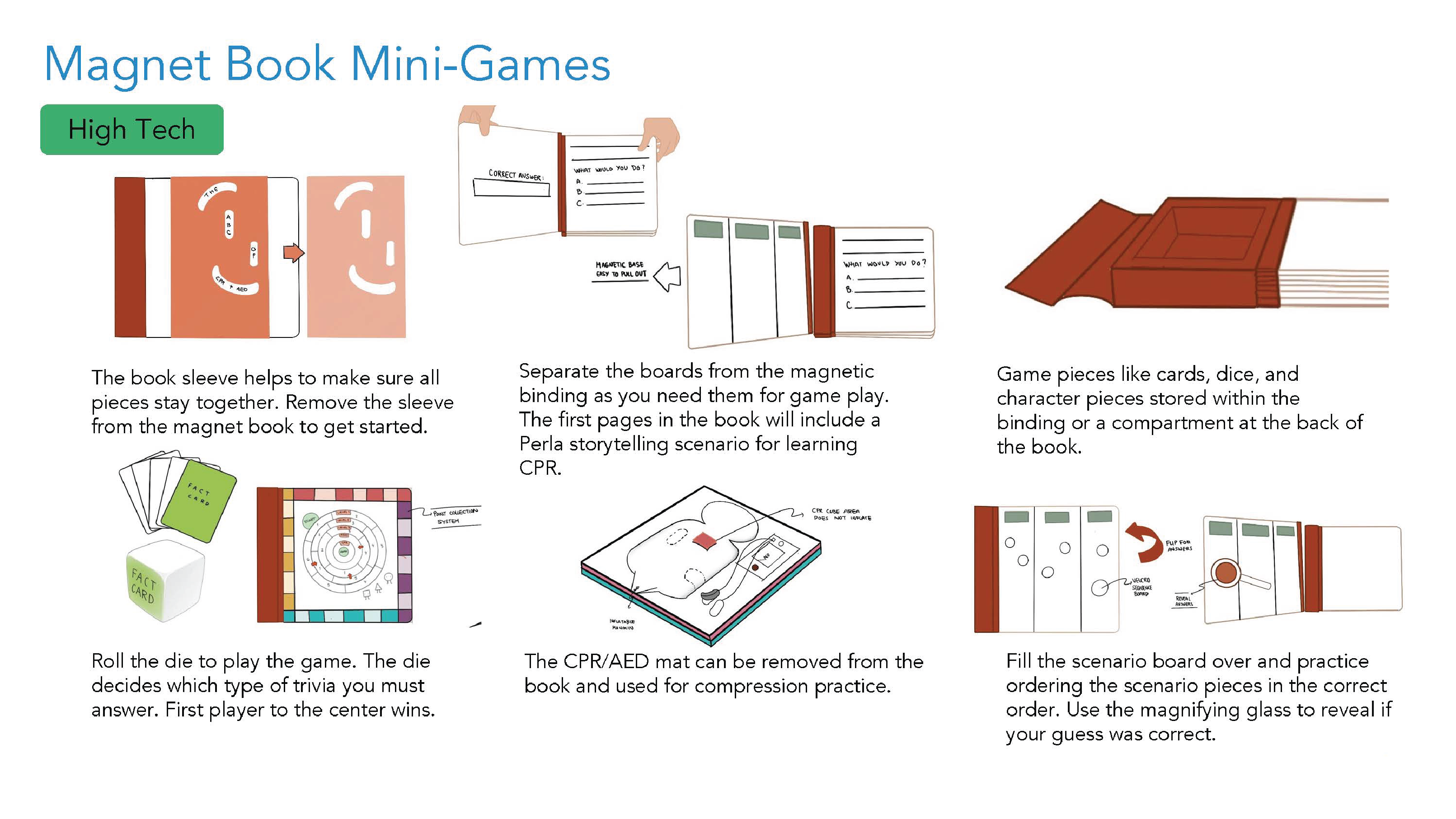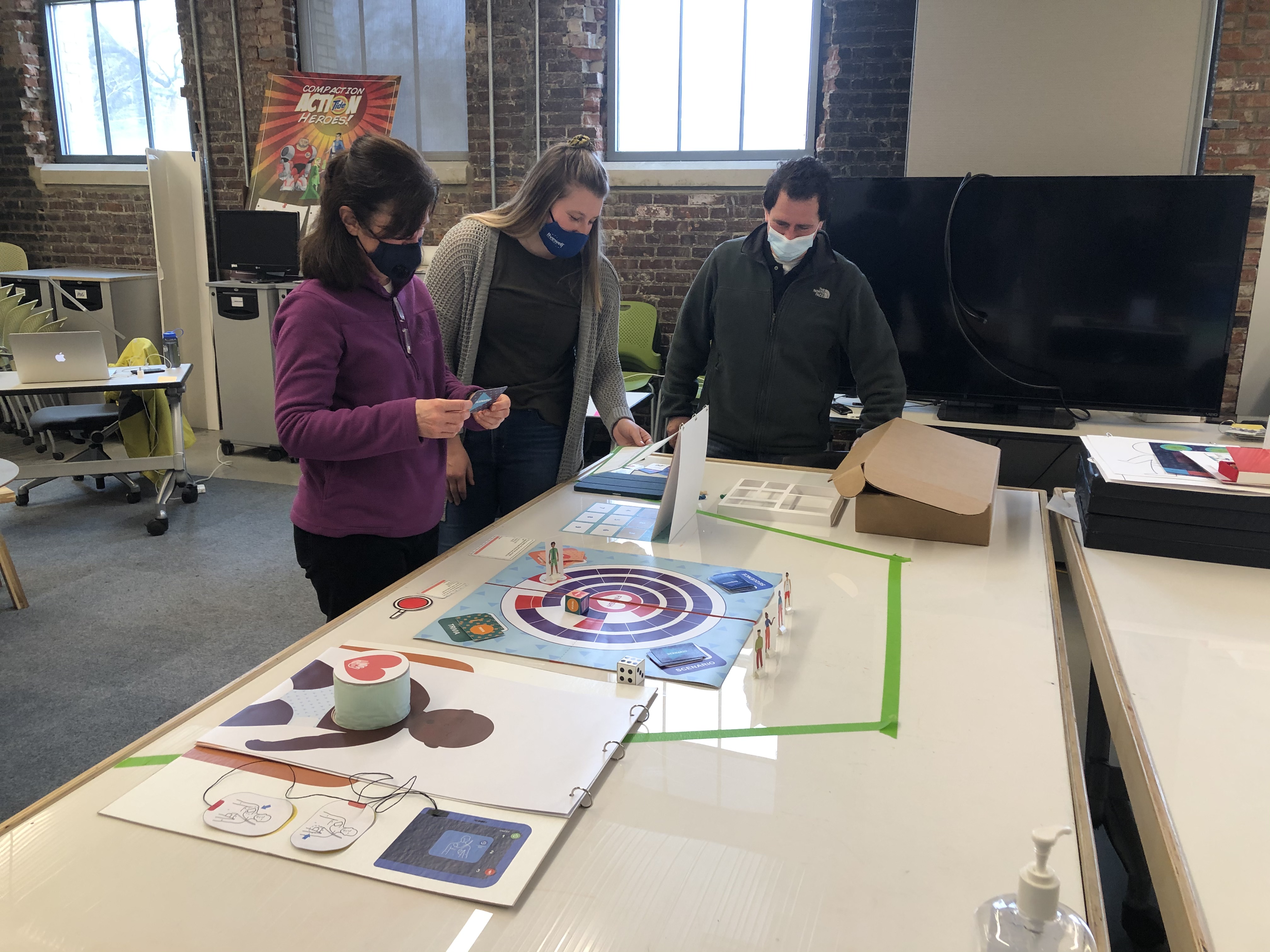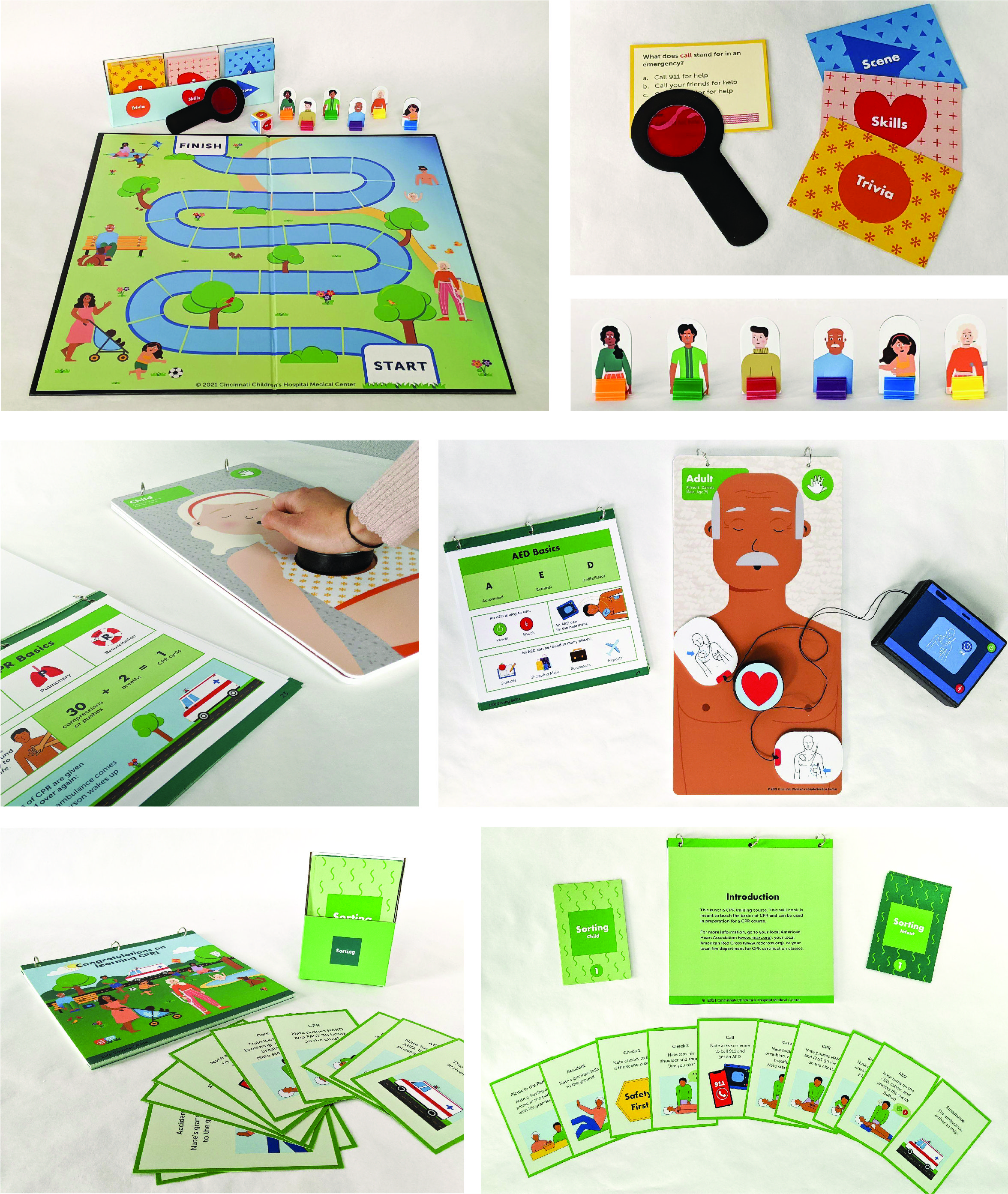 The team did another round of prototyping to create a single refined model before completing the final kit prototypes. Both the LWC team and CCHMC team conducted final rounds of co-creations with IDD learners using this refined prototype. From these sessions, the team made decisions to rework the board game path style and make minor changes to the game cards, AED, and manikin to increase comprehension. The team met with vendors to discuss prototype cost and finalize the materiality of the kit’s different elements. Much of the refinement phase was spent designing and finalizing the graphics for all of the components and finalizing the prototype game play.